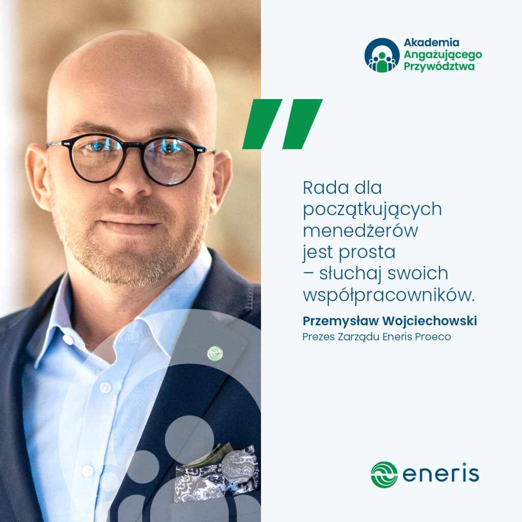 Przed nami kolejna rozmowa z Mentorem Akademii Angażującego Przywództwa. Głos zabrał Przemysław Wojciechowski, Prezes Zarządu Eneris Proeco, który w swojej wypowiedzi podkreśla siłę uważnego słuchania współpracowników, mówi o znaczeniu szerszego spojrzenia na problemy oraz o tym, czego dowiedział się o swoim stylu zarządzania dzięki programowi.